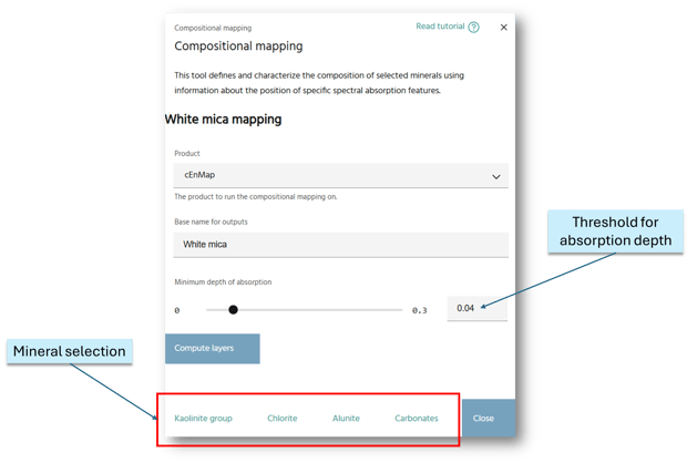 Additionally, we've redesigned the workflow of this tool to make it simpler to generate and modify your outputs. Simply switch between minerals using the tabs at the bottom. Modify the absorption depth minimum slider to modify the threshold for mineral identification. All outputs are added to a dedicated folder - make sure nothing is on top of it!